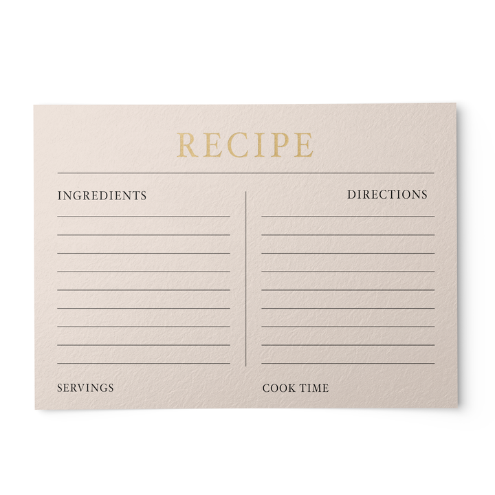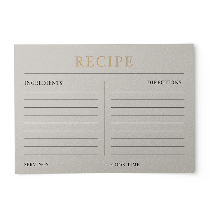 Each 4x6 card is crafted from luxuriously thick cardstock, with a subtle texture that feels both grounded and graceful in hand. The word “RECIPE” is pressed in matte gold foil—a quiet shimmer that catches the light without demanding attention.