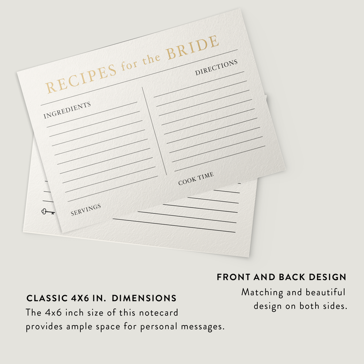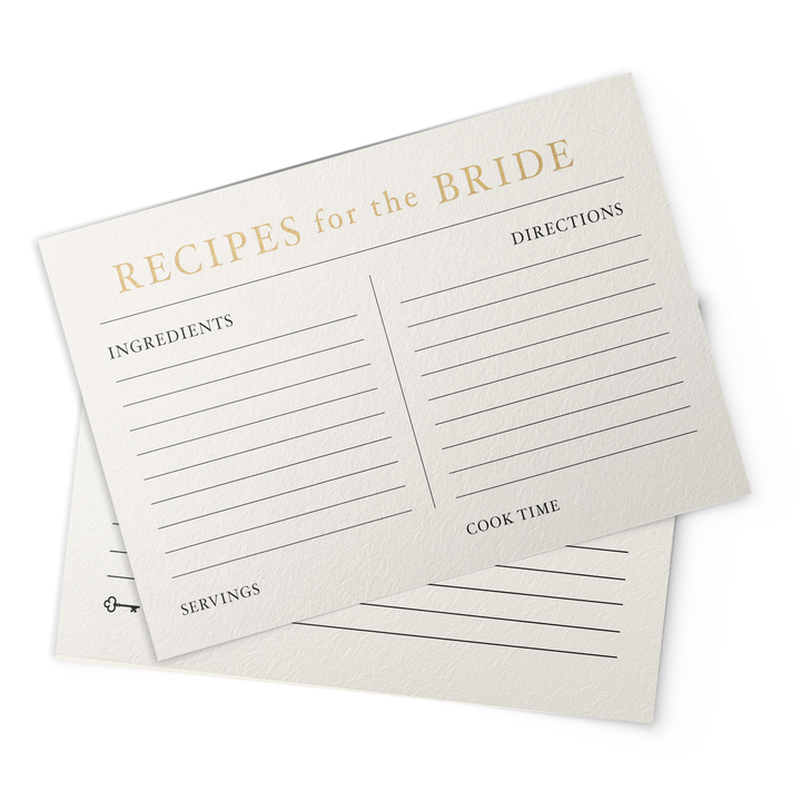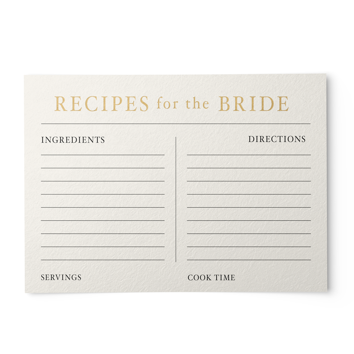 Each 4x6 card is crafted from luxuriously thick cardstock, with a subtle texture that feels both grounded and graceful in hand. The word “RECIPE” is pressed in matte gold foil—a quiet shimmer that catches the light without demanding attention.